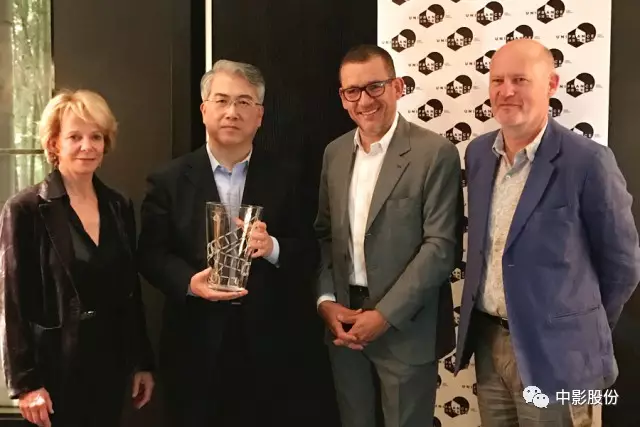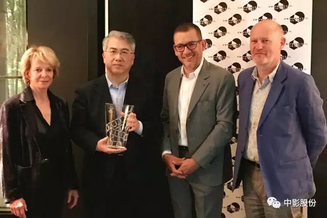 4月13日,中影股份董事长喇培康荣获法国电影联盟颁发的“法国电影奖”,法国著名演员丹尼·伯恩向喇培康颁发了奖杯,法国国家电影中心(CNC)主席菲黛丽克·布勒丹女士,法国电影联盟主席让保罗·萨罗米先生,中影股份副总经理周宝林,中影股份器材公司和制片分公司相关负责人出席了颁奖仪式。
