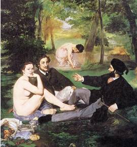 1863年,马奈(Édouard Manet, 1832-1883)一幅《草地上的早餐》(Le déjeuner sur l’herbe)震惊法国艺术界,在“落选沙龙”上一展成名。这幅画在构图上致敬文艺复兴时期名画《田园合奏》(Fête champêtre),又在描绘主题、空间表现形式和绘画技法上有了不少创新。例如用更抽象的色块和更粗略的画法代替学院派绘画对风景的精细描绘, 大胆地将普通人在野外的裸露躯体描绘出来。在这之前,只有神灵享有这份待遇。
