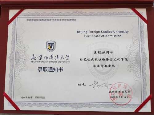 王政涵,济南外国语学校2022届学生,保送北京外国语大学2022级法语专业